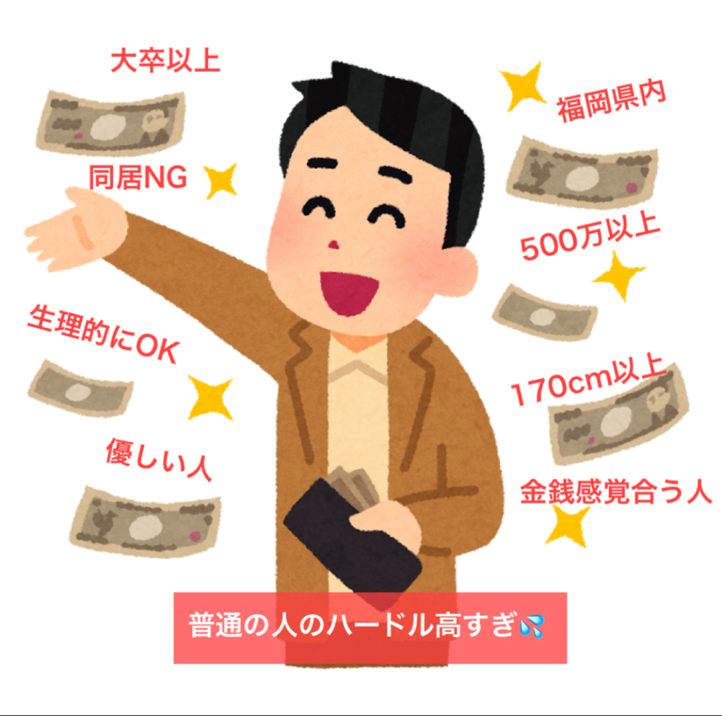 医者じゃなきゃ嫌とか、年収1000万以上とか言ってるわけではなく、どれもこれもそんなに高望みではないと思うので。