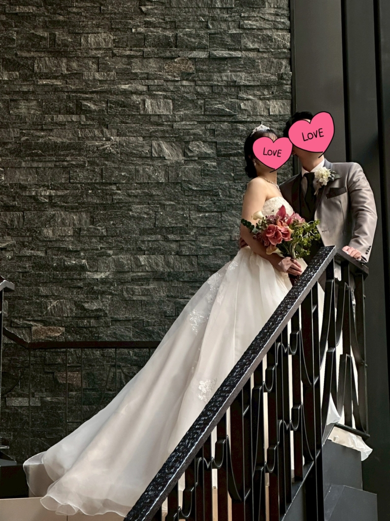 今日は夕方から別の会員様の成婚お祝い会が入っていたので、TAKAMI館内の洋装の撮影まで見に行くことができませんでしたが、先ほど彼女がドレス姿を送ってきてくださいました!