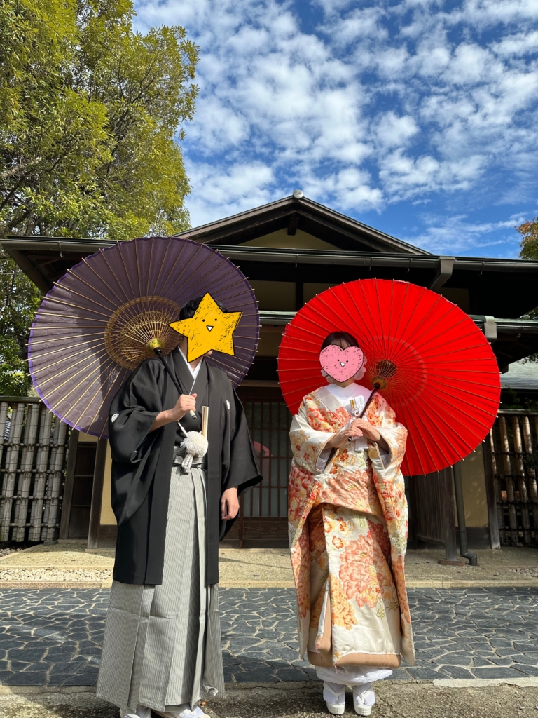 青い空と、お二人の和装のコントラストがとっても綺麗で。